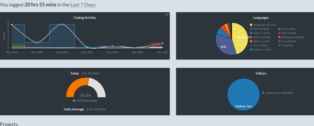 看看每周多少时间花费在编码上。免费版只能看最近 7 天的数据。